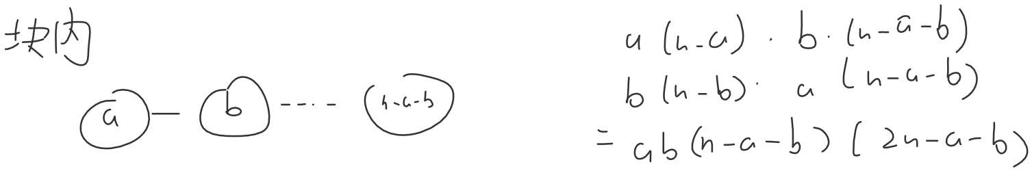 不妨设虚线边断开,实线边把一个连通块分为大小为 $a,b$ 的两块,则这条实线边的贡献是上面的式子。