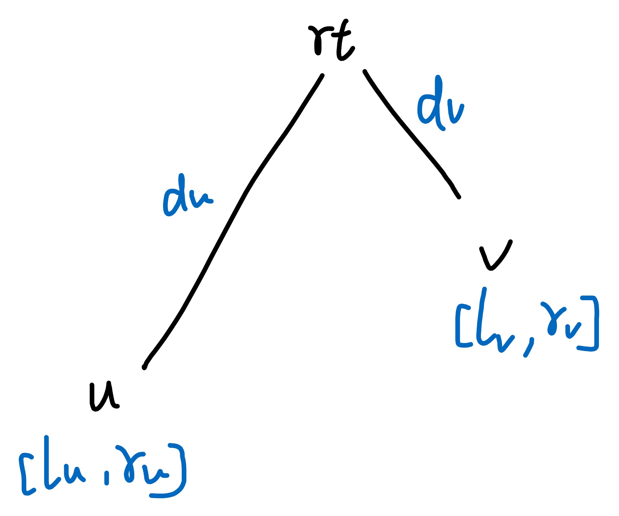 $$ (d_u+d_v)\frac{|[l_u,r_u]\cap[l_v,r_v]|}{|[l_u,r_u]|\cdot|[l_v,r_v]|} $$我们可以维护一个线段树,在搜到 u 的时,把 $[l_u,r_u]$ 区间加 $\frac{d_u}{\|[l_u,r_u]\|}$。搜到 v 时,把 $[l_v,r_v]$ 区间的和,乘以 $\frac1{\|[l_v,r_v]\|}$,加到答案里即可,这样我们就解决了上式中第一项。