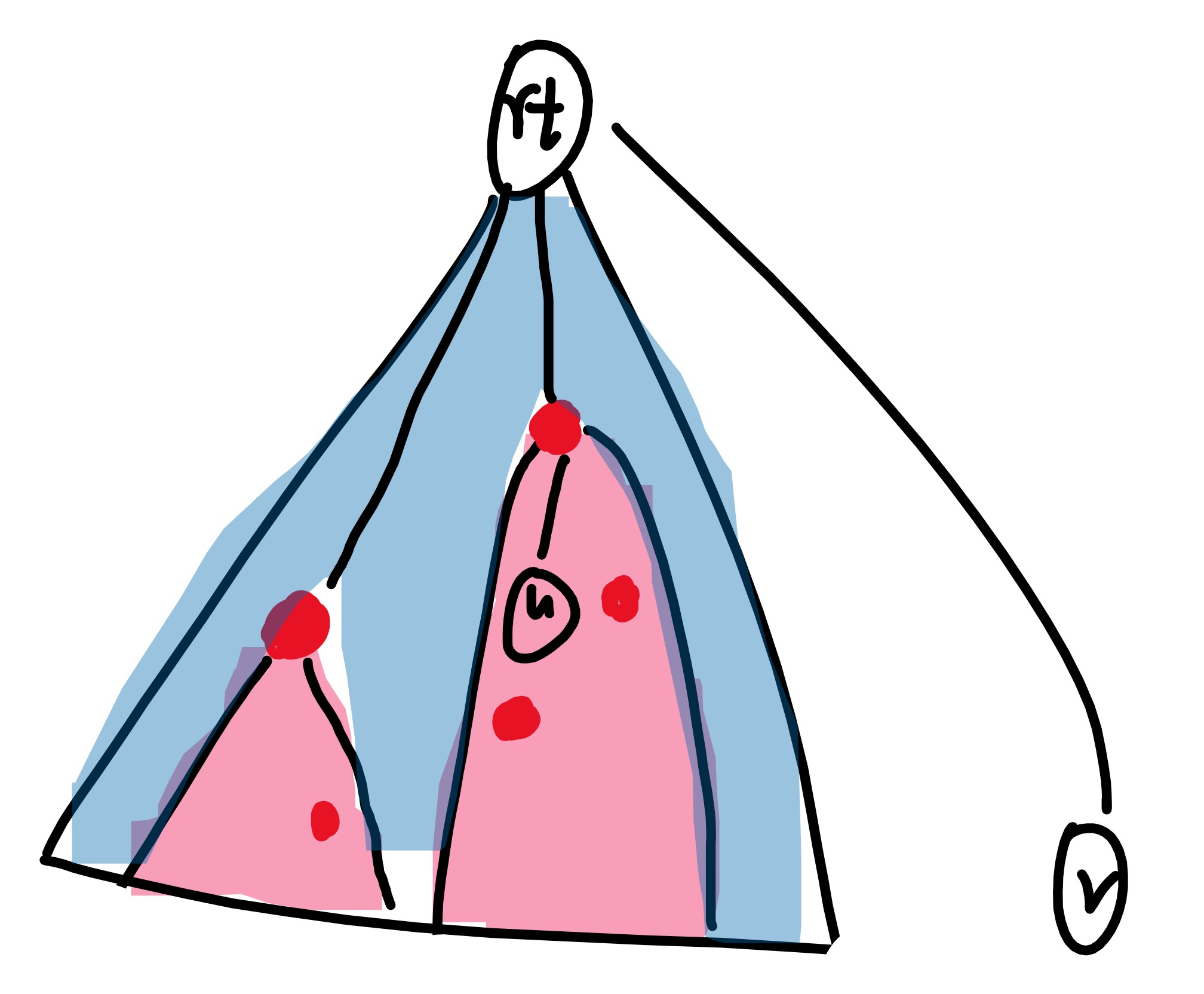 上图中,蓝色大三角表示所有搜过的子树,v 是正在查询的点,对于所有过分治中心 rt 的路径 $u \sim v$,考虑红色对哪些路径有贡献,发现有两种情况: