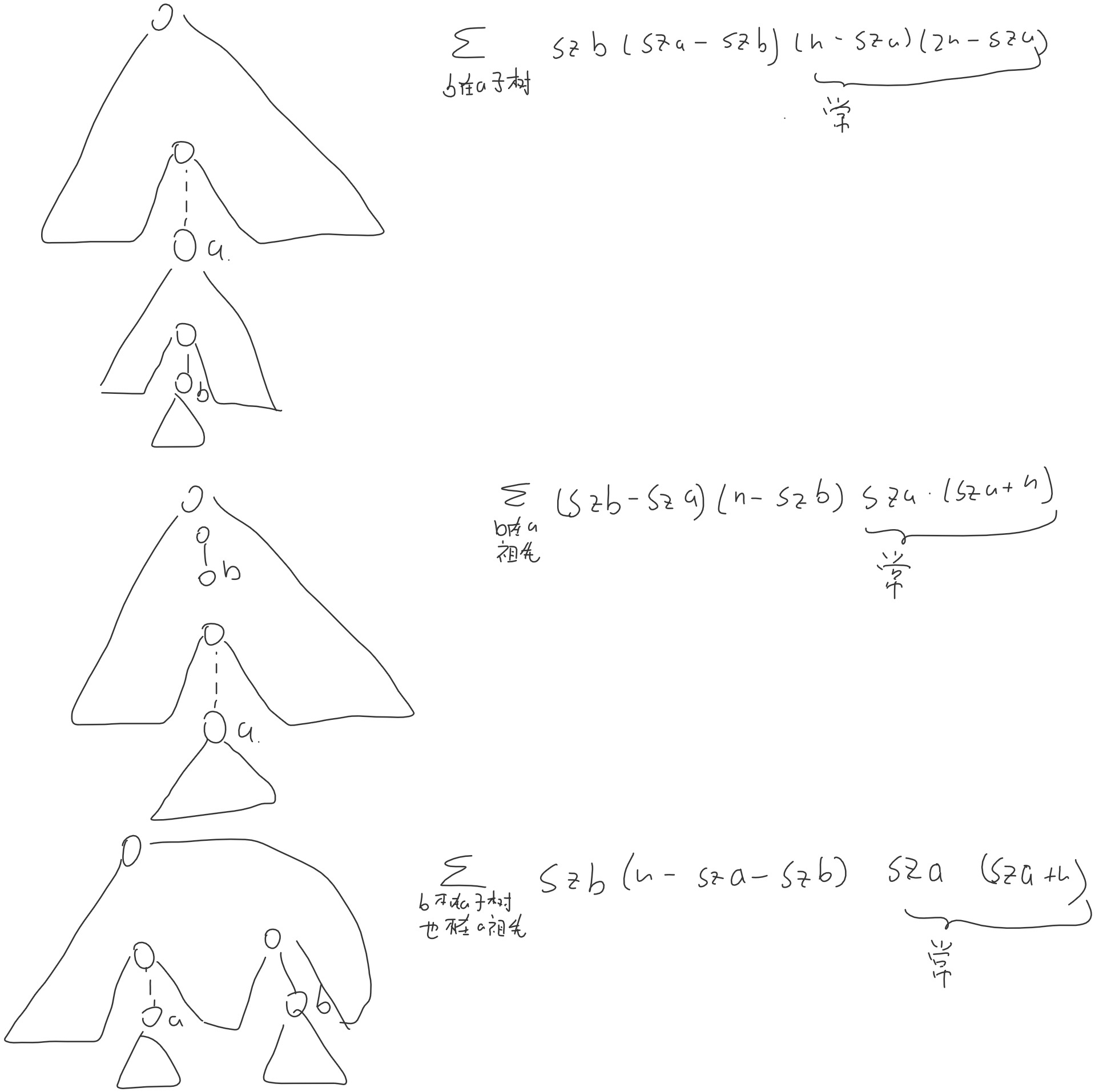 可以发现,三个贡献的式子后两项都只和 a 有关,前两项都可以展开成和 b 有关的二次多项式,因此只需要维护下子树内,祖先上的 sz 的和,sz 的平方之和即可快速计算。