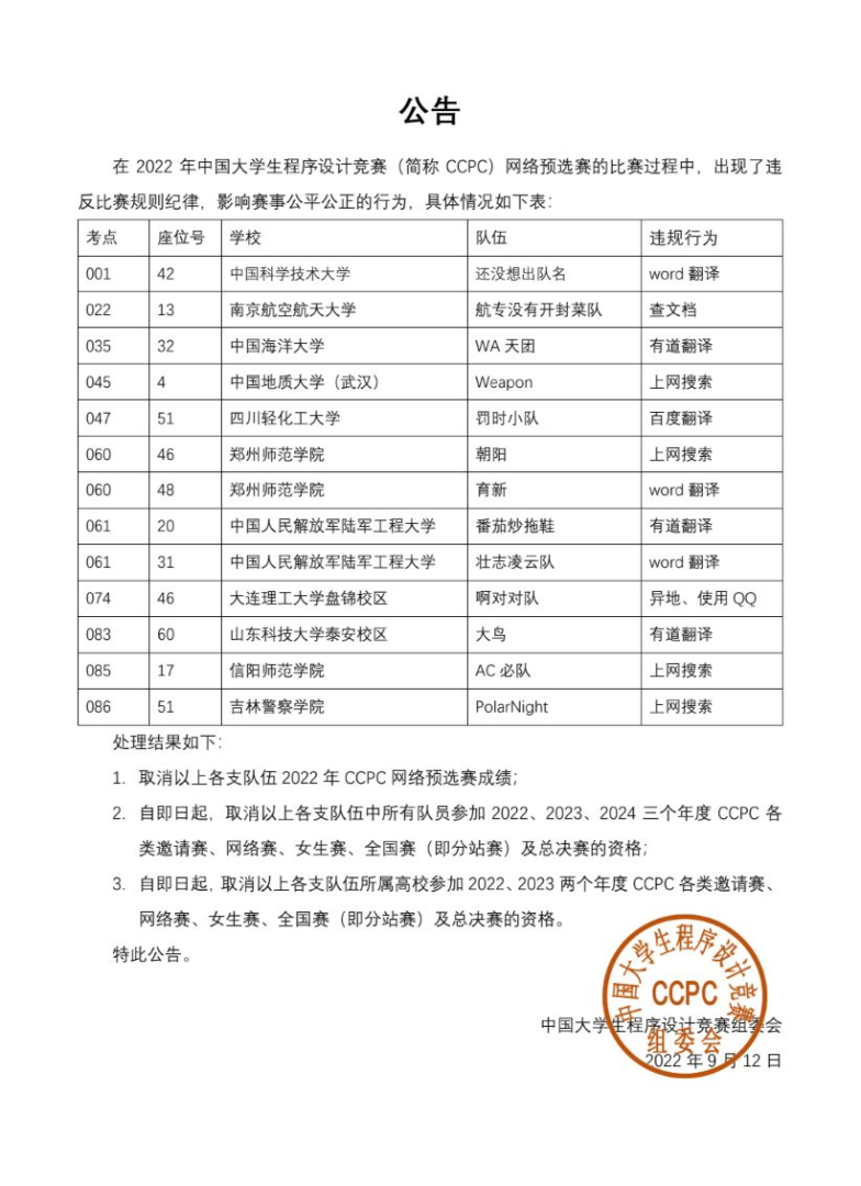 我们理解并支持诚信参赛,公平竞争。对作弊行为必须零容忍,必须严格处理。对于作弊者,作弊队伍来说,一切后果都是咎由自取。但是,对于其他诚信参赛的队伍来说,这样“一人犯法,株连九族”的连坐,则极为不公平。